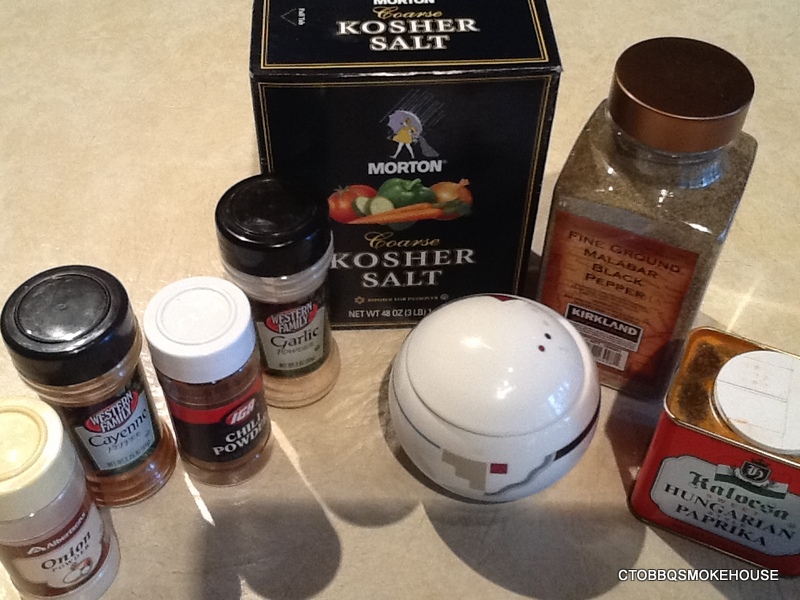 3/4 cup paprika. 1/4 cup black pepper. 1/4 cup salt. 1/4 cup sugar. 2 tbsp. chili powder. 2 tbsp. garlic powder. 2 tbsp. onion powder. 2 tsp. cayenne pepper.