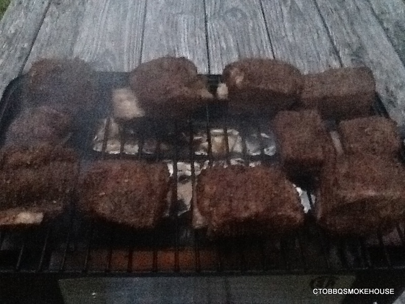 Place ribs on a grill with smoke or a 375 degree smoker for 45 minutes. Remove and place ribs on a baking sheet bone side down.