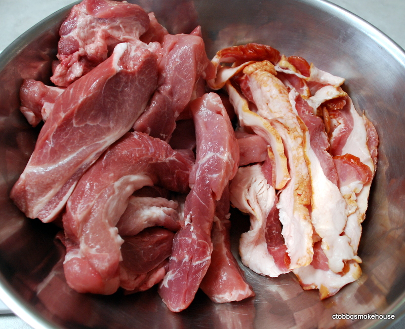 I use pork and pork back fat in my traditional recipe. Today I am using bacon ends instead of the pork fat to give it a little change of flavor.