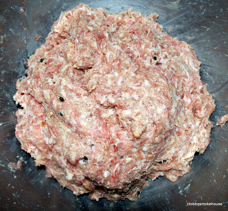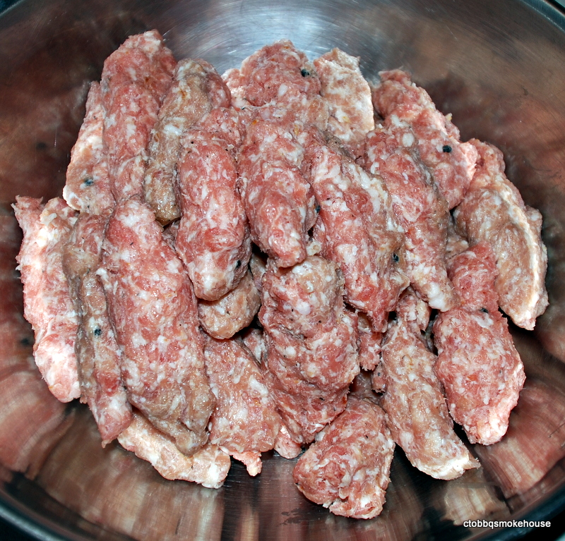 To make it easier to regrind the meat, I form little pieces that easily feed down the grinding tube. Grind and stuff the casings using a large grinding plate as the whole peppercorns need to pass through.