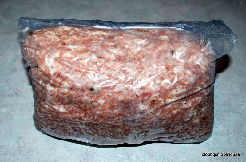 Grind the partially frozen meat and fat using a 3/8 grinding plate. Mix in dry ingredients and mix thoroughly. Place in a ziplock bag and pack tightly removing all air and sealing. Put in the refrigerator and let cure for 4 days.