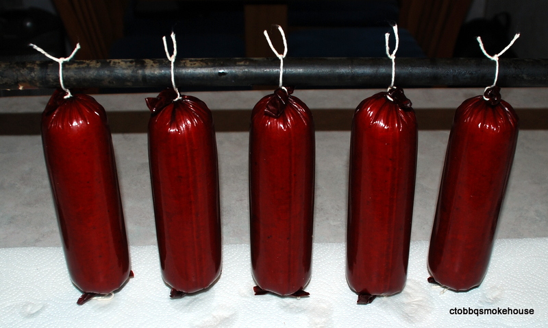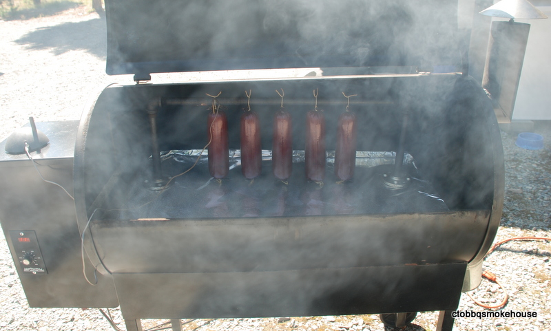 Insert a temperature probe into one of the salamis and place in smoker @ 110 degrees. When the internal temp reaches that, raise smoker temp to 125 degrees. When that temp is reached, raise smoker temp to 155. The salami is done when 155 degrees is reached. Remove salami still on the smoke rack and shower with cold water until the internal temp reaches 110 degrees. Gently wipe the salami with paper towels.